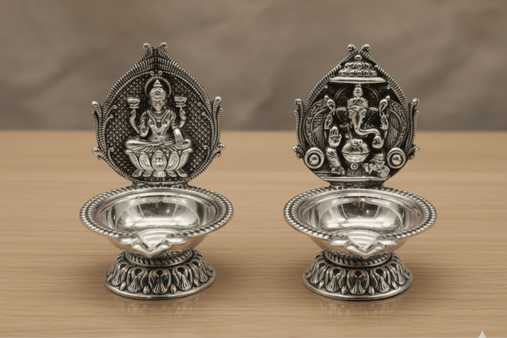 Exquisite silver pooja items crafted with fine silver, perfect for traditional rituals and worship. These items include silver aarti plates, diya lamps, bells, and other essentials designed to enhance your spiritual practices. Ideal as thoughtful gifts for religious occasions and festivals.